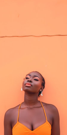 Close up of a confident young woman with a peach copyspace background for text