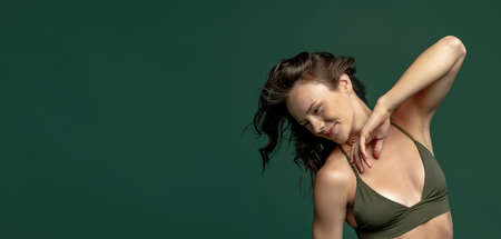 Flyer with young pretty girl, female model in green lingerie, swimsuit posing isolated over dark green studio background. Natural beauty concept
