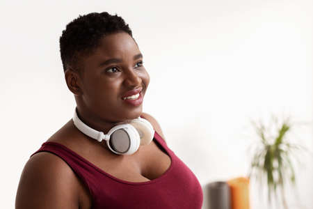 Results with resolve. Plump, plus size african american woman in sportswear and headphones holding towel around her neck, posing in studio over grey background