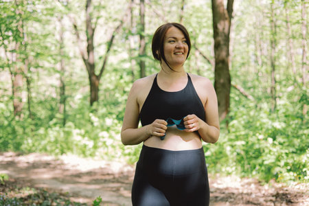 Positive sporty plump black woman with wireless headset