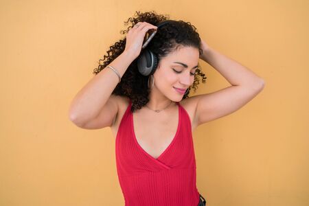 Portrait of young afro woman enjoying and listening to music with headphones. Technology and lifestyle concept.