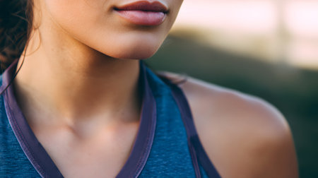 Close-up of a sporty young woman in sportswear outdoors. lips close up, faceless young woman, selective focus. copy space