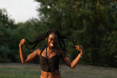 Portrait of a young black female playfuly moving her braids while sticking out her tongue at the park