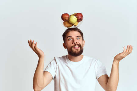 man with fresh fruit in a glass cup gesturing with hands vitamins health energy model bushy beard mustache