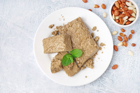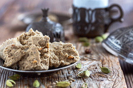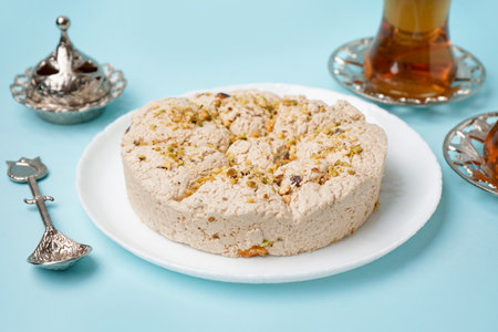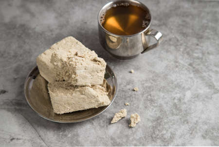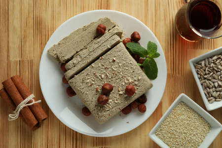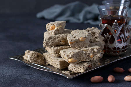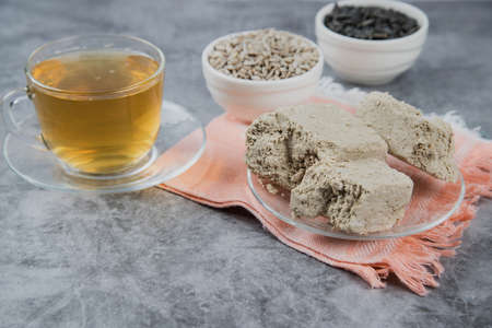 Tea ceremony with oriental halva dessert made from sunflower seeds.