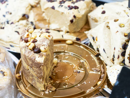 Pieces of sunflower seeds halva with pistachios displayed for sale at an weekend street food market, in soft focus