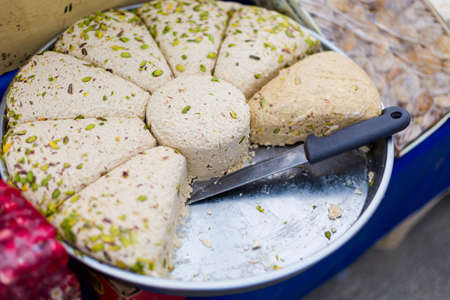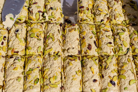 Portion of halva with vanilla and pistachio on stall at bazaar. High calorie snack