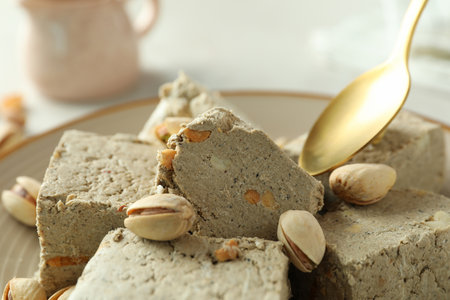 Plate of tasty Tahini halva with pistachios on light background, closeup