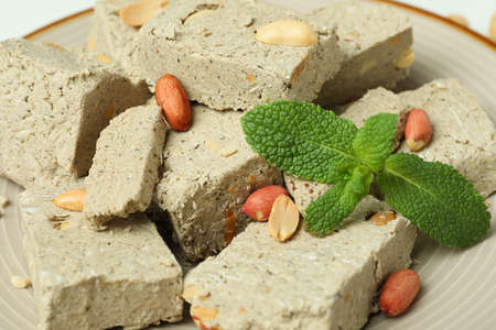 Plate with slices of tasty halva and peanuts on white background