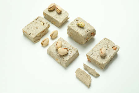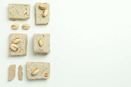 Flat lay with halva and pistachio on white background