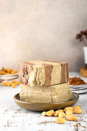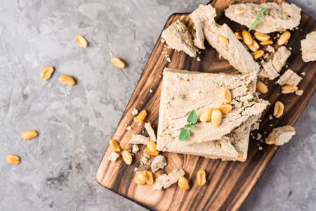 Peanut halva on a light brown background top view-side space for text. Halva oriental sweets