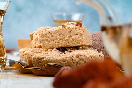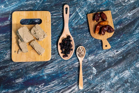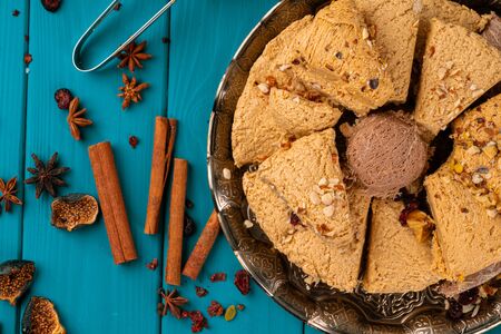 Turkish halva national dessert on blue wooden table