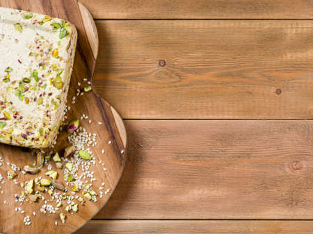 Sesame halva with pistachios on a teak chopping board on a brown wooden background. Top view. Copy space.