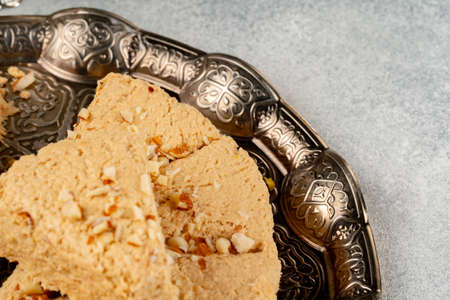 plate with halva from sunflower seeds and tea on a bronze tray, selective focus. Still life with halva in Arabic style
