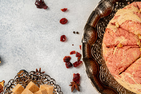 Halva with dried fruits on arabic dishware