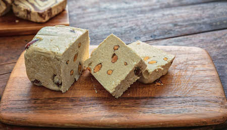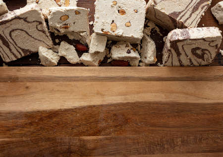 Halvah variety cocoa and almonds on wooden table background, copy space, template. Halva or halwa pieces, traditional dessert confection made with sunflower seeds or sesame tahini.