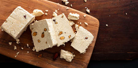 Halva tahini and almonds on wooden table background. Vanilla halvah or halwa pieces with nuts, top view, template. Traditional dessert confection made also with sunflower seeds.