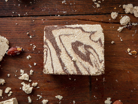 Halva almonds and cocoa on wooden table background. Vanilla halvah or halwa pieces with nuts, closeup, Traditional dessert confection made with sunflower seeds or sesame tahini.