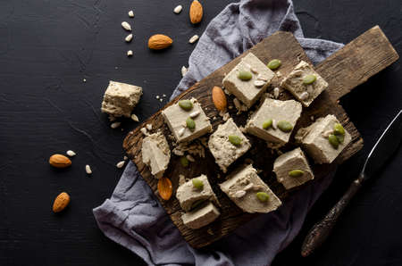 Sunflower halva on a dark background. Traditional oriental dessert. Flat lay