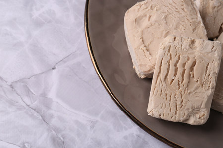 Compressed yeast on white marble table, closeup. Space for text