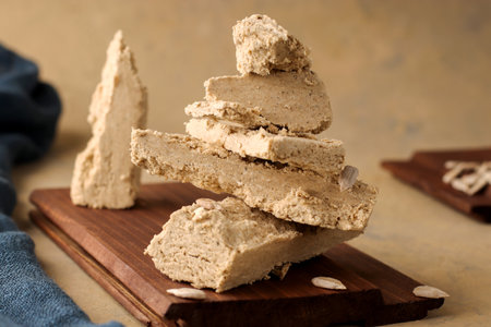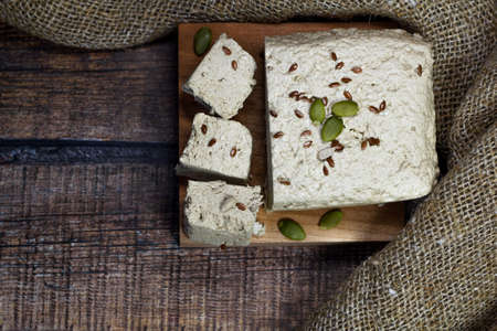 Sunflower halva on a wooden board and a light background with blue textiles. Natural vegan product. Eastern sweetness. Rustic style. Close up.