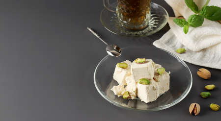 Natural vegan product. Halva with pistachios on a glass plate on a dark background. Turkish, Arab and Jewish national sweets. Traditional oriental dessert Chekme. Copy space