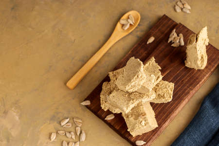 Tasty sweet dessert halva prepared from sunflower seeds on brown background with copy space. View from above.