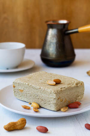tasty dessert.national traditional sweetness of Turkish and arabic halva with cup of coffee on the table.piece of halwa prepared from sunflower seeds with peanut on the white plate.copy space.vertical
