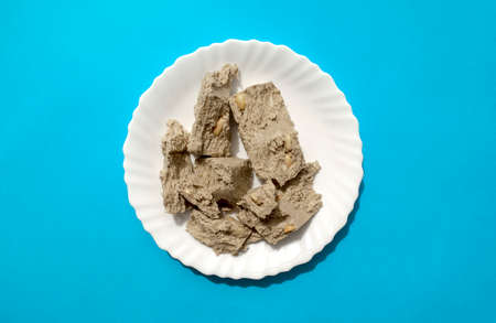 Sunflower seed halva in white plate on blue background. Famous russian sweets. Halvah with peanuts.