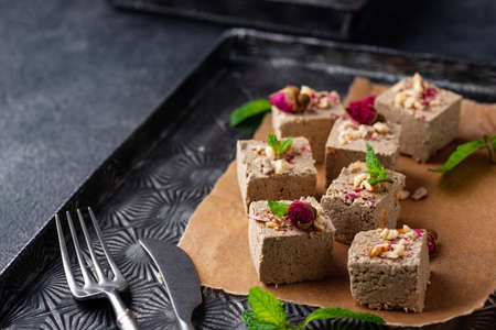 Tasty eastern sweet dessert halva from sunflower seeds, cocoa and tahini on gray background.Traditional dessert confection in Middle East, Balkans and west Asia.Horizontal.Copy space