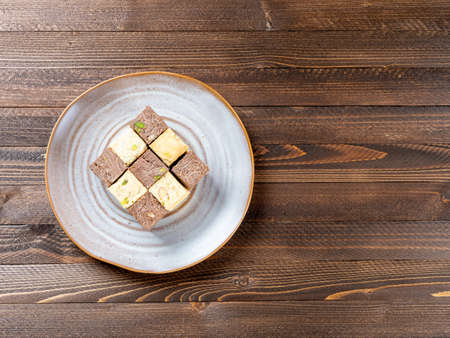 Indian sweets lying on a brown plate on a brown wooden background. Assorted Indian sweets: Coconut Soan Papdi, Chocolate Soan Papdi, Premium Soan Papdi, Mango Soan Papdi. top view.