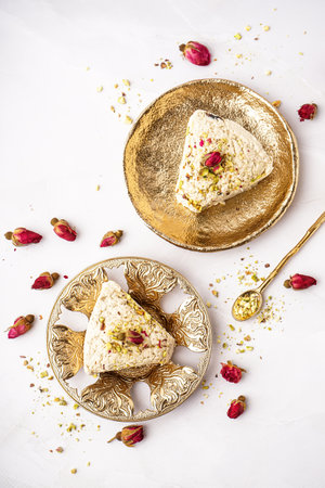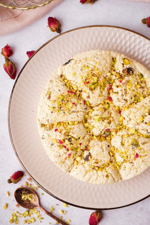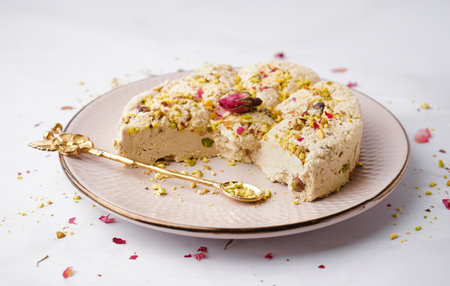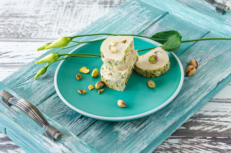 orient pistaschio sliced halva. sweet dessert on a plate with flowers.