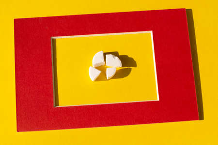 crushed white pill on a yellow background. Medicine and health care concept.