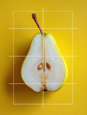 A cut pear rests on a simple yellow surface. A rule of thirds composition grid is visible.