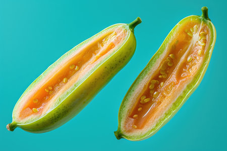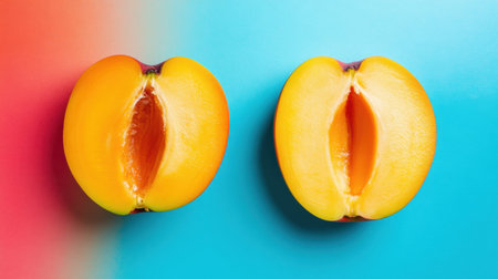 A captivating image showcasing two peach halves with a vibrant yellow hue against a blue background. This visually striking arrangement highlights the fruit's fresh appeal.
