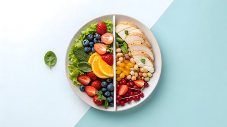 Vibrant plate features mixed greens, chicken slices, and assorted fruits.
