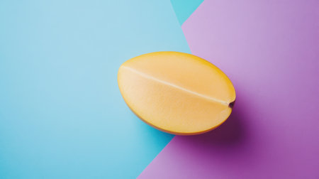 A yellow oval fruit is placed on a vibrant geometric background, showcasing a pastel blue and purple contrast. This image captures modern food aesthetics, ideal for various creative projects.