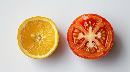 Whole orange and tomato slice together, creating a vibrant image on a white background
