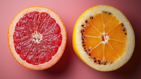 A grapefruit and orange half cut, on a pink background.