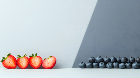 A minimalist composition featuring halved strawberries on the left and rows of blueberries on the right, separated by a stark diagonal shadow.