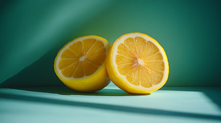 Generative AI Image of Fresh Healthy Sliced Lemons on Clean Empty Plain Green Surface