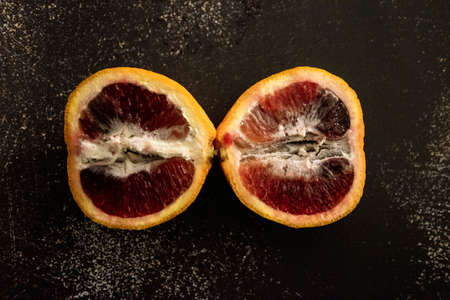 Blood or red orange fruit halves in hands on black background. Person holding halved ripe citrus fruit with red juicy flesh, selective focus