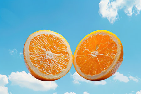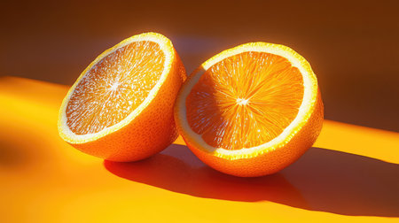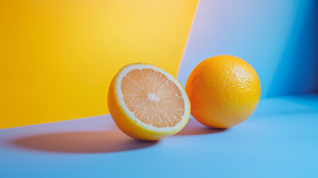 A fresh whole orange and a half-sliced orange placed against a vibrant yellow and blue background, symbolizing freshness, fruit, and healthy living.