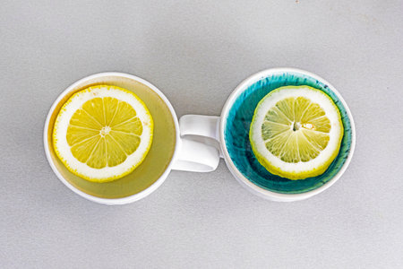 two cups with lemon slices on the table. Psychology health and attitude