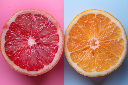 A close-up image of a pink grapefruit slice on a pink background and an orange slice on a blue background.