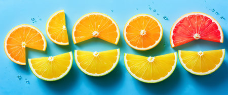 Assorted citrus slices arranged on blue background