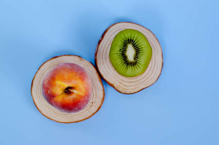 Top view of fresh delicious peach and kiwi. Creative concept of healthy detox, fruit diet or vegetarian food concept. Copy space.
