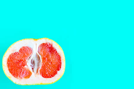 Sliced fresh grapefruit on bright blue background, minimal concept, copy space for the text