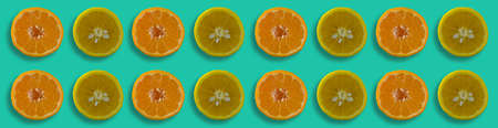 Fruit pattern of fresh tangerine and lemon slices on green background. View from above. Copy space. Pop art design, creative summer design. Banner, flat lay