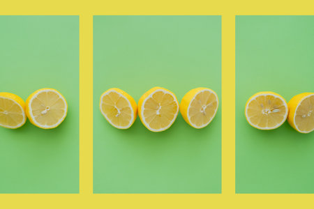 Top view of halves of fresh lemons on green and yellow background